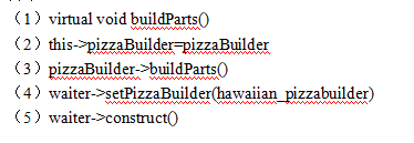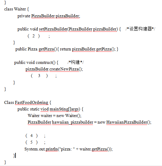 阅读下列说明和?C++代码,将应填入(n)处的字句写在答题纸的对应栏内。【说明】阅读下列说明和?Java代码,将应填入?(n)?处的字句写在答题纸的对应栏内。【说明】某快餐厅主要制作并出售儿童套餐,一般包括主餐(各类比萨)、饮料和玩具,其餐品种类可能不同,但其制作过程相同。前台服务员?(Waiter)?调度厨师制作套餐。现采用生成器?(Builder)?模式实现制作过程,得到如图?6-1?所示的类图。<img border="0" alt="" src="//up.zaixiankaoshi.com/questions/image/715/13309221_0.png"><img border="0" alt="" src="//up.zaixiankaoshi.com/questions/image/715/13309221_0_1.png"><img border="0" alt="" src="//up.zaixiankaoshi.com/questions/image/715/13309221_0_2.png"><img border="0" alt="" src="//up.zaixiankaoshi.com/questions/image/715/13309221_0_3.png">