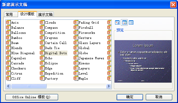 利用“设计模板”选项卡所建立的文稿是一种包含总体设计格式但无内容的文稿。利用“演示文稿”选项卡所建立的文稿是一种既包含总体设计格式有包含所需内容的文稿。