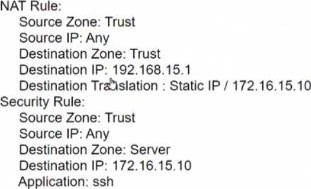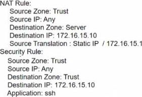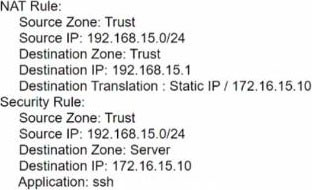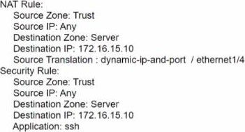 Refer to the diagram.<p><img src="https://up.zaixiankaoshi.com/8166307/question/c4210083f01f7ca93d6e5b2cb607f9f9.png" alt="c4210083f01f7ca93d6e5b2cb607f9f9.png"></p><p>Users at an internal system want to ssh to the SSH server The server is configured to respond only to the ssh requests coming from IP 172.16.16.1.</p><p>In order to reach the SSH server only from the Trust zone, which Security rule and NAT rule must be configured on the firewall?</p>