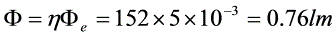,而 P = 60w,η= 15lm/w,得光源的光通量为:Φ1=ηP=15×60 = 900lm,又灯泡作为在各方向均匀发光的点光源,则Ω=4π所以 光源的发光强度:(2)据可求在距灯泡2m处的垂直照明的屏上的光照度为